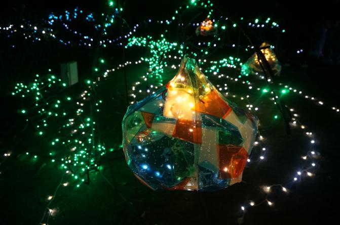 約15万球の光が湖畔の夜を彩り、ガーデン内は「森」や「砂漠」「海」などのゾーンに分かれ、それぞれに「いきもの」をテーマにした光のアートオブジェが登場。