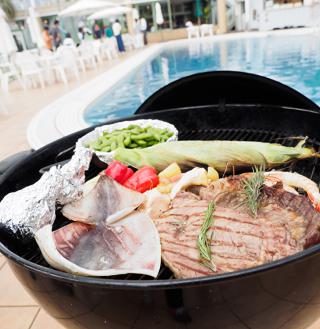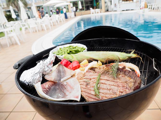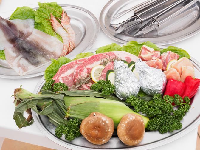 セット内容:焼き枝豆/厚切りプライムビーフ/ポークチョップ/かしわの川中の淡海地鶏/えび/いか/焼き野菜