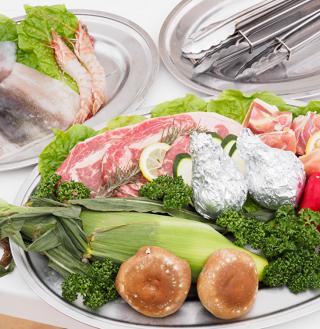 セット内容:焼き枝豆/プライムビーフ/かしわの川中の淡海地鶏/えび/いか/焼き野菜