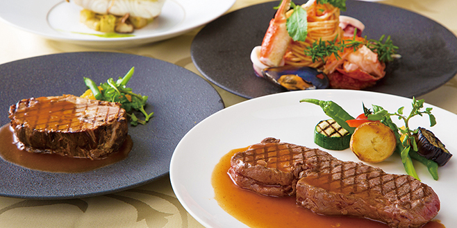 この秋は五感で感じる秋食祭(うまいもん)フェアを開催。「モンサンミシェルのメロディ」では、7種から選べるメインに、弁当箱に入った洋風八寸、蟹のフラン、シェア形式のサラダなどが揃い、デザートブッフェにコーヒーまで付いてくる! 海や山の幸をふんだんに使用した女性限定「マダムが集うご褒美ランチ」も必見。復刻版のアラカルトメニューなども豊富。