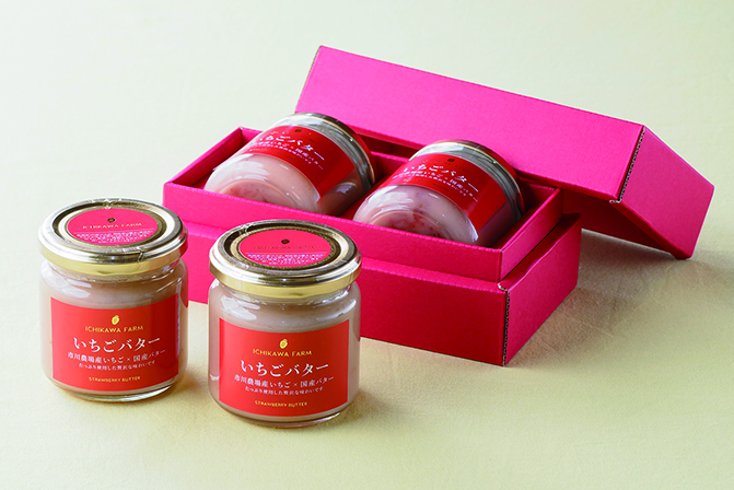 自社農園で栽培された高品質の朝摘み苺「章姫」と北海道産バターを贅沢に使った『いちごバター』。苺とバターを半分ずつの割合で使用し、濃厚でほんのり酸味があり、すっきりとした味わい。見た目の可愛らしさはもちろん、何度も試行錯誤を繰り返し、一口食べて「美味しい」と思える自信作に。ニューヨークなどでも販売している海外にまで認められた逸品。
