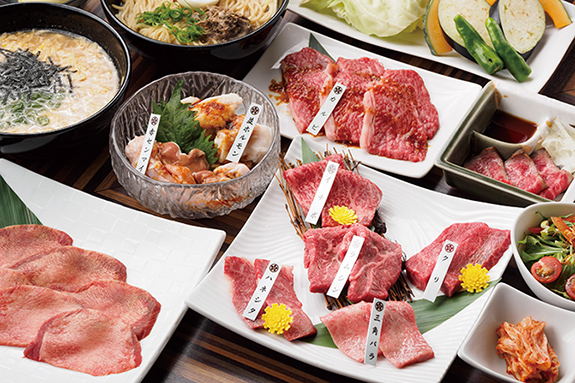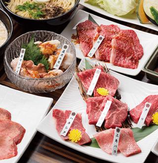 お通し、上タン塩、近江牛ローストタタキ、極上近江牛5種盛り、近江牛1種、日替わりホルモン2種、焼野菜、テールぞうすいorテールそば、キムチ盛り合わせ、サラダ、シャーベット