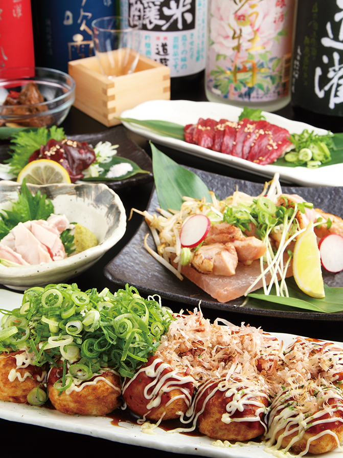 プロが作る外はカリッ、中はトロトロの絶品たこ焼きは、特注のカマドで湯がいた生蛸を使用。その他、熊本直送の新鮮な馬刺しや一口餃子、手羽先餃子など多彩なこだわりメニューが揃う。超炭酸ハイボールや草津の太田酒造「道灌」とコラボした日本酒も人気!