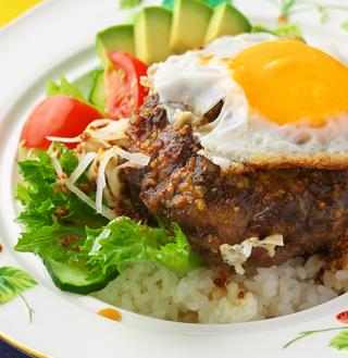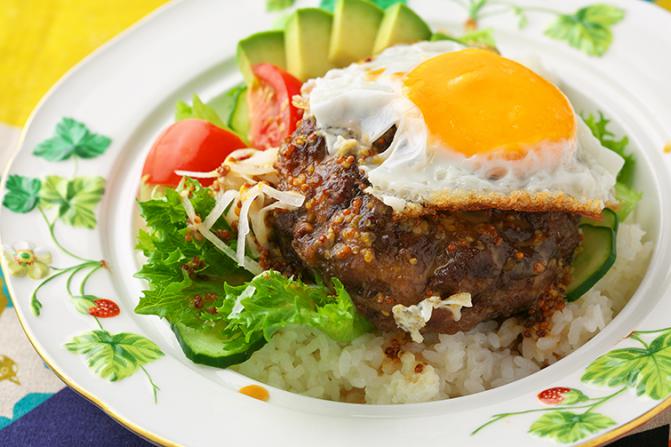 8. ガーリックバターライス、サラダ、ハンバーグ、ソース、目玉焼きの順に盛り付けて完成。