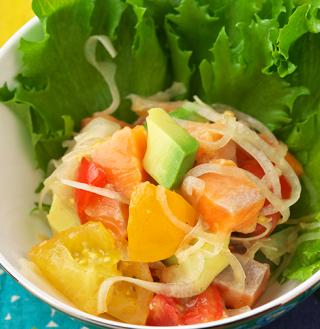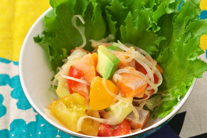 2. サーモン、トマト、アボカドを1.5cm角に切る。