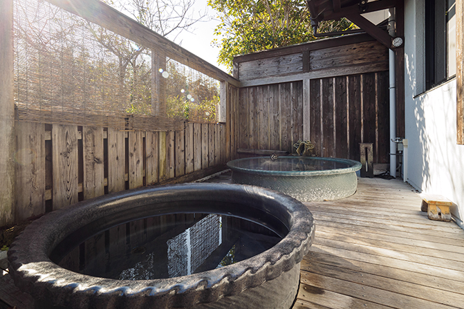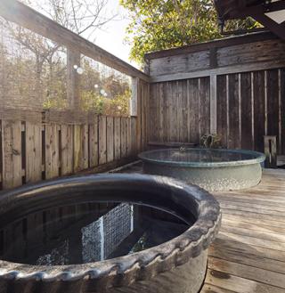 開湯120年を誇るこちらは 、程よい湯加減と滑らかな泉質が肌に優しい美肌の湯 。初代・喜兵衛が夢で神のお告げを受け、小高いお宮の麓の岩を持ち上げると温泉が湧き出たとか 。 貸切風呂は 「赤たぬき」「黒たぬき」の2種。ガラス戸から陽が差し込む開放的な大浴場も素敵。