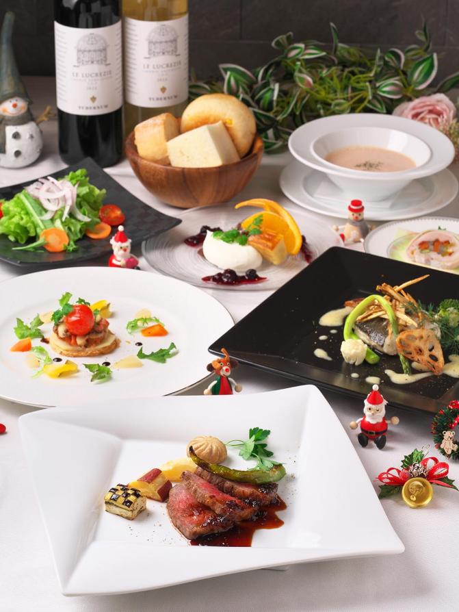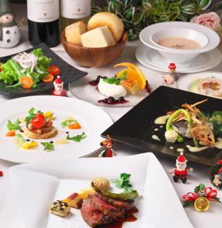 小さなアミューズ/スモークサーモンとシャンピニオンのタルト/オマール海老のビスク/真鯛のコンフィ/国産黒毛和牛フィレ肉グリルステーキorリブロース肉グリルステーキ/焼きたて自家製パン/X’masデザート/ドリンク