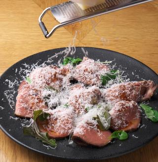 前菜5種/シーザーサラダ/カルパッチョ3種/生ハムとイタリアンサラミ盛り合わせ/クアトロシカゴピザ/牛赤身肉のステーキ/トリュフ香るきのこクリームソース/ベイクドチーズケーキ