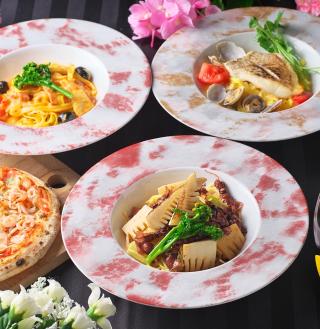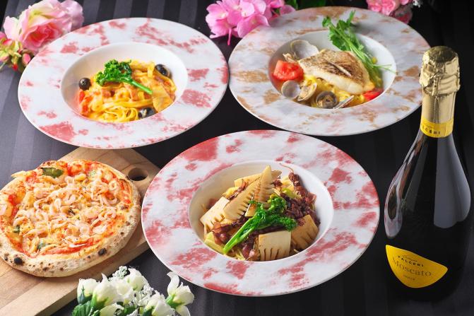草津の「デラメーラ」の「プリマベーラコース」は、新鮮野菜のサラダにピザ、パスタ、メイン、さらにドルチェまで付いた大満足のコース内容。大人数の場合もビュッフェ形式で利用可能だから、会社の歓送迎会などに最適。演出などの相談もOKだから、忘れられないひとときを叶えたい人はぜひ相談してみて。