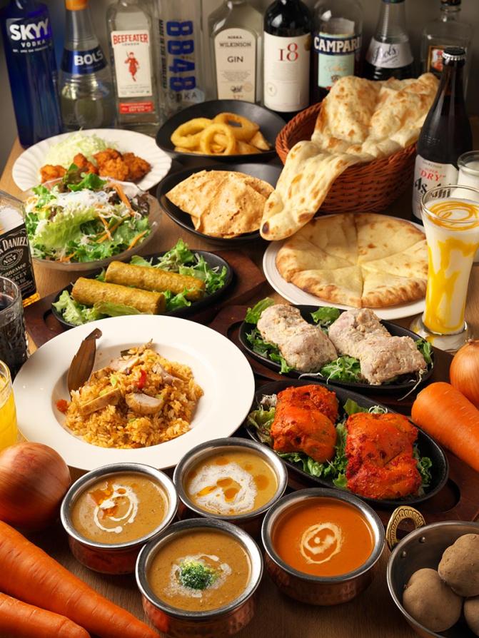 メニュー例:タンドリーグリーンサラダorシーザーサラダ/骨なしタンドリーチキン/シシカバブ/唐揚げ/チキンチリ/オニオンフライ/フライドポテト/選べるカリー/選べるナン/ライス/ビリヤニ/デザート/選べるドリンク(ラッシー可)など
