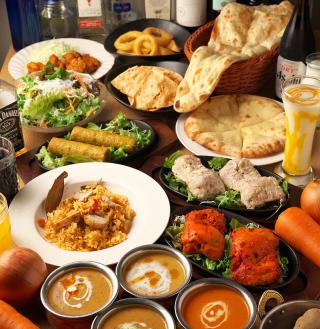 メニュー例:タンドリーグリーンサラダorシーザーサラダ/骨なしタンドリーチキン/シシカバブ/唐揚げ/チキンチリ/オニオンフライ/フライドポテト/選べるカリー/選べるナン/ライス/ビリヤニ/デザート/選べるドリンク(ラッシー可)など