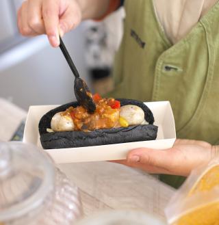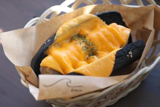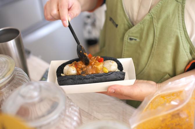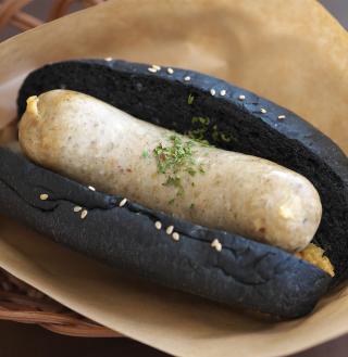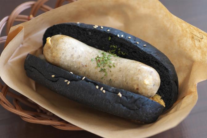 デトックス効果のある竹炭パウダーを練り込んだ真っ黒なパンは、食べてみると驚くほど甘くて柔らか。アメリカンサイズの大きなソーセージとの相性も◎!