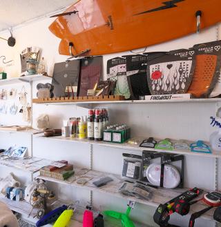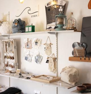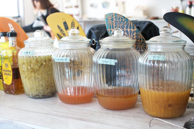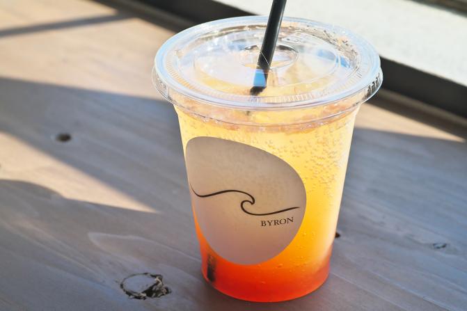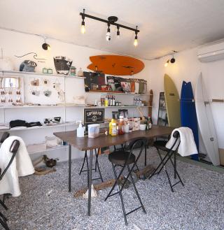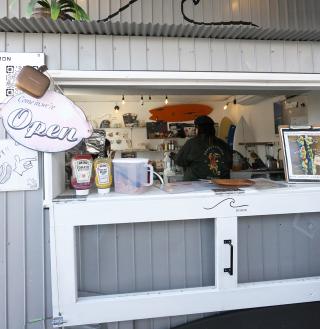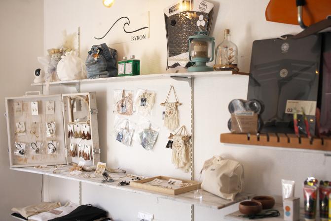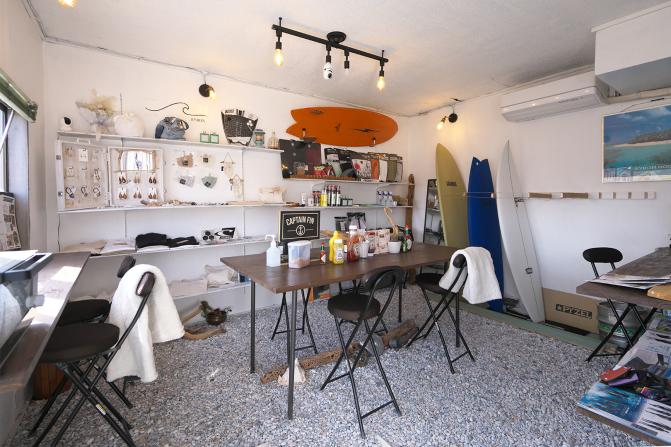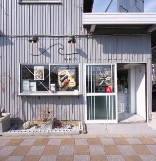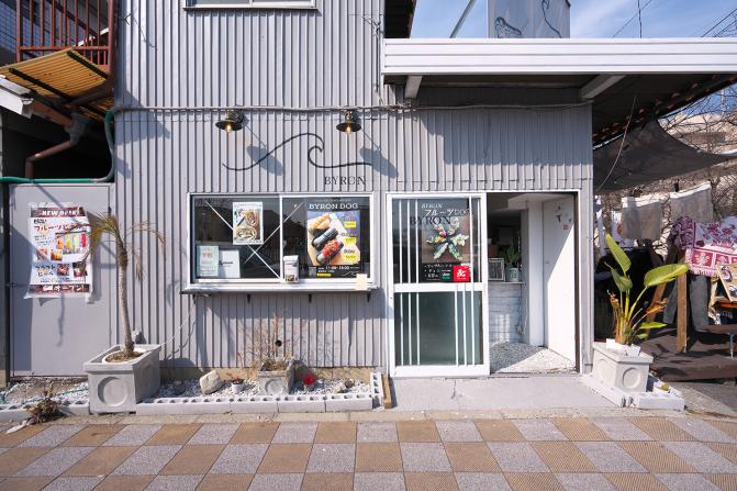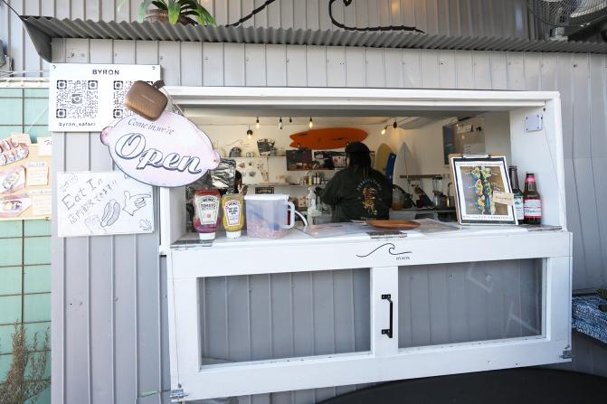竹炭パウダーを練り込んだ黒いホットドッグが人気の「BYRON」。店主の浅田さんは現役サーファー兼講師、さらには同店から徒歩30秒のところにあるレストラン「safari surfers」の店主、サーフグッズのネットショップ運営など、様々な顔を併せ持つ。店主自らDIYで作り上げた店内の床には砂利が敷かれ、まるで海辺に遊びに来たかのような雰囲気。食べる人の健康を意識したこだわりのフードやドリンクの他、アルコール類も多く、滋賀で唯一「ブルックリンラガービール」が楽しめるお店としても知られている。