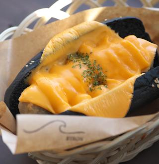 スライスチーズ×チーズソースがトッピングされた、チーズ好きにはたまらない一品! テイクアウトの際にはレンジで30秒温めると◎