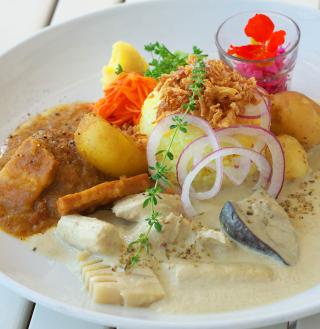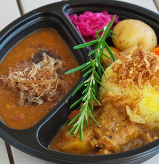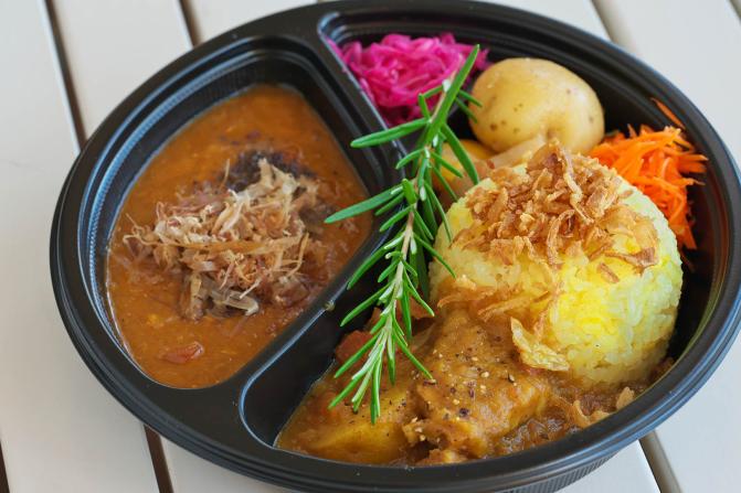 月桂樹と一緒に炊き込んだターメリックライスに、辛さ×濃厚クリーミーなバランスが絶妙なグリーンカレー&玉ねぎたっぷりの洋風カレーのあいがけ。どちらも季節野菜とハーブをたっぷり使用。箸休めにぴったりな、色とりどりの惣菜と一緒にどうぞ。