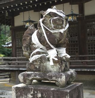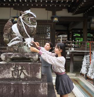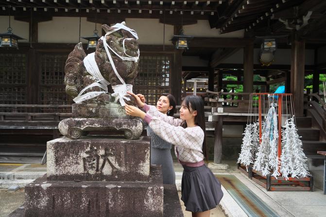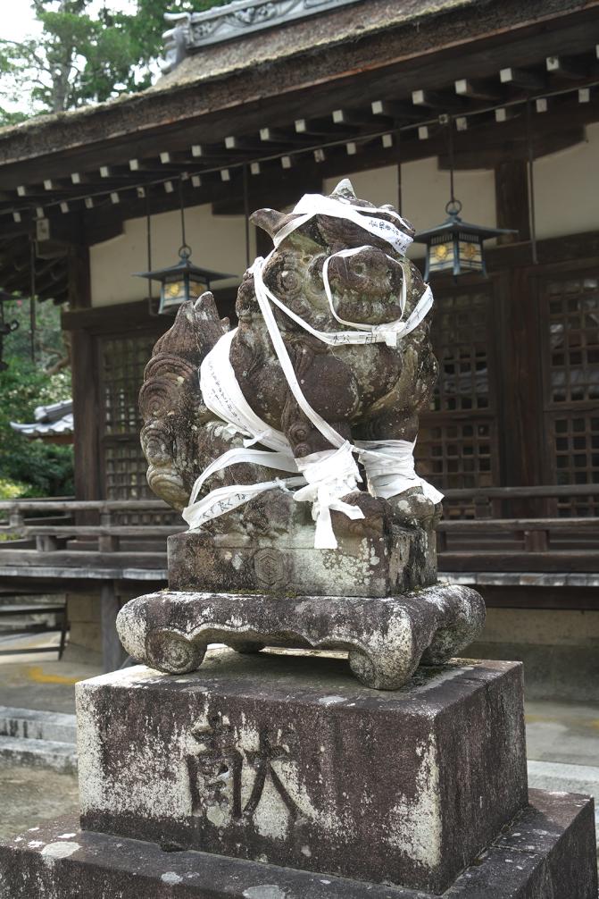 県下有数の古社「兵主大社」で祀られている八千矛神(やちほこのかみ)は、名前に「矛」があることから、勝負の神様として戦国武将から重宝されてきた。琵琶湖の対岸からやってきた神様で、琵琶湖を渡る際には白蛇に姿を変えて亀に乗り、鹿に守られてやってきたという逸話も。また、変わっているのが、包帯で巻かれたような見た目をした狛犬。これは古来より、ケガをした所と狛犬の同じ場所に「祈祷布」と呼ばれる祈祷用の白い布を巻いて治癒を祈願してきた、今も受け継がれる風習だ。訪れた際は、狛犬にも要注目!