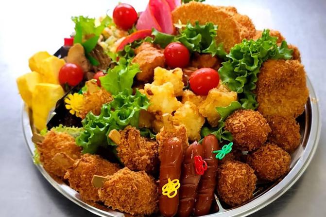 手作り姫コロッケ/若鶏の唐揚げ/ひと口トンカツ/ミニ串カツ//ハムカツ/扇形ソーセージ/自家製しぐれ煮/手作り焼豚/手作りポテトサラダ/フライドポテト/ウインナー/新鮮野菜など 全12品