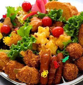 手作り姫コロッケ/若鶏の唐揚げ/ひと口トンカツ/ミニ串カツ//ハムカツ/扇形ソーセージ/自家製しぐれ煮/手作り焼豚/手作りポテトサラダ/フライドポテト/ウインナー/新鮮野菜など 全12品