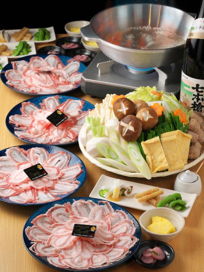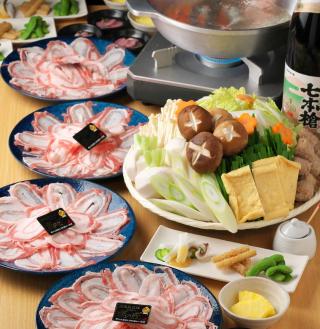 前菜/日本酒しゃぶしゃぶ・寄せ鍋(銘柄豚・とり団子・野菜盛り合わせ/豆腐/油揚げ)/〆雑炊/漬物/デザート