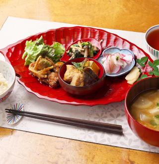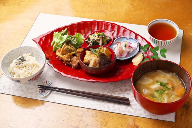 肉・魚を使わない、オーガニック野菜がたっぷり摂れるランチ。取材時のメニューは、豆グルテンの唐揚げ・甘酢あんかけ・かぼちゃとおからこんにゃくの煮物・きのことほうれん草のオイスター炒め・白かぶと赤かぶの酢の物・味噌汁・3分づきの自然米ご飯