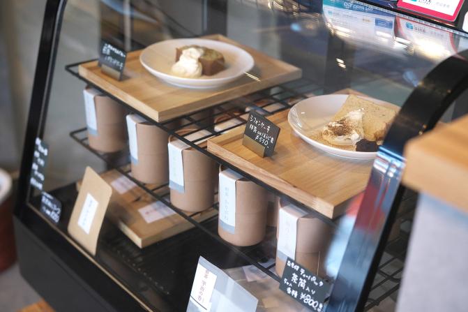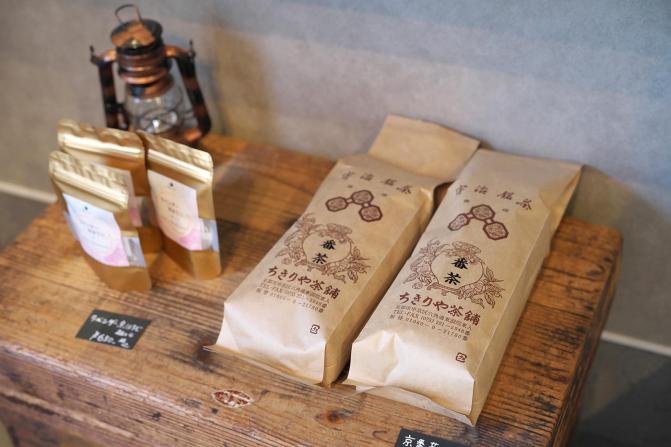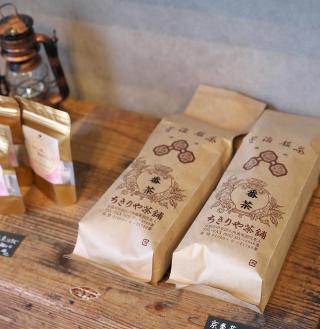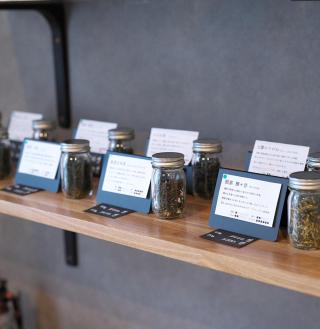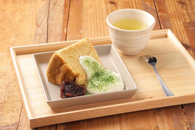 玄米茶を抽出して練りこんだシフォンケーキには、甘さ控えめな生クリームと挽きたての宇治抹茶をトッピング。添えられたあんこを付けて味変もオススメ!シフォンケーキのお供には温かいお茶も一緒にどうぞ。取材時のお茶は「煎茶 千利」350円。甘いスイーツと相性が良く、苦味がしっかりと感じられるお茶が好きな人に◎。40g440円、80g880円で茶葉も販売