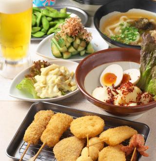 串カツ8種(串カツ牛/串カツ豚/レンコン/玉ネギ/ハムカツ/アジフライ/タコウィンナー/うずら)/キャベツ(ソース)/枝豆/梅きゅうり/ポテトサラダ/マカロニサラダ カレー風味/かすうどん/ポテトフライ/ミニデザート/飲み放題120分(90分LO)