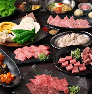 上塩タン/上カルビ/特選ハラミ/赤身ロース/中落カルビ/本日のホルモン/厚切りベーコン/キムチ/チシャ菜/キャベツ盛/選べる〆のご飯/焼野菜/デザート