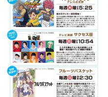 【イナズマイレブン アレスの天神】 毎週木曜日 夜 5:25 【テレビ演劇 サクセス荘】 毎週日曜日 夜 10:54 【フルーツバスケット】 毎週日曜日 深夜 2:30