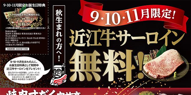 秋生まれの方へ!9・10・11月限定・近江牛サーロイン無料!【焼肉すだく家族亭・近江焼肉ホルモンすだく】