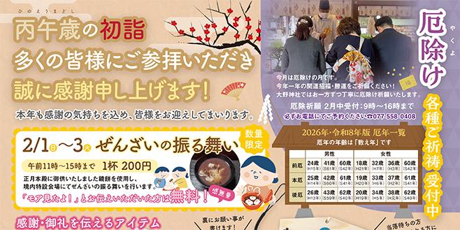 厄除け・各種ご祈祷受付中/ぜんざいの振る舞い・特別コラボ朱印プレゼントも!【大野神社】